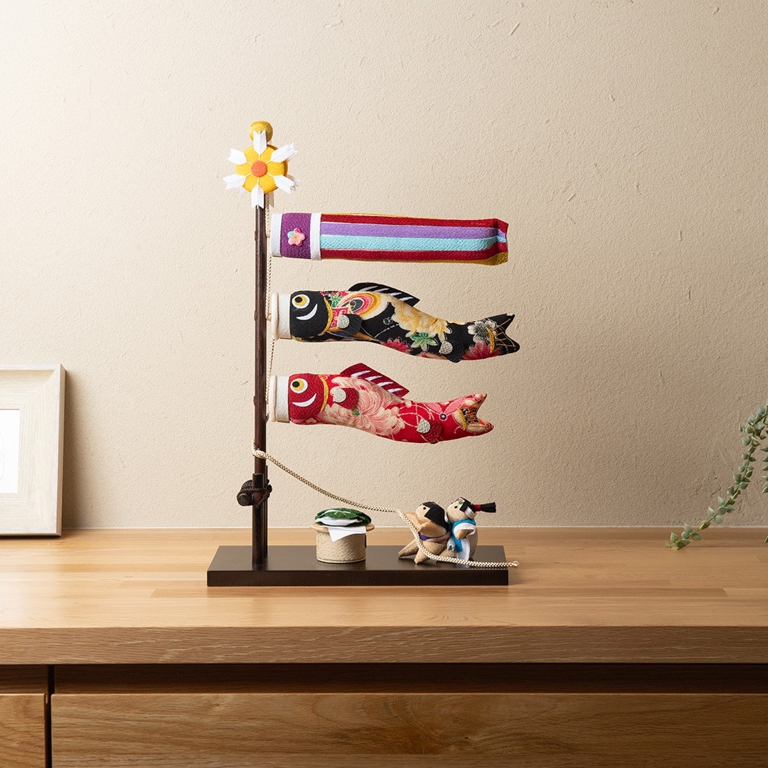 木製の台座に立つ一本の支柱から、色彩豊かな鯉のぼりが風に舞うように配置されています。黒・赤の鯉には金や緑、ピンクなどの装飾が施され、立体感と華やかさを演出。現代の住空間にも自然に馴染む、洗練されたモダンな佇まいを演出しています。