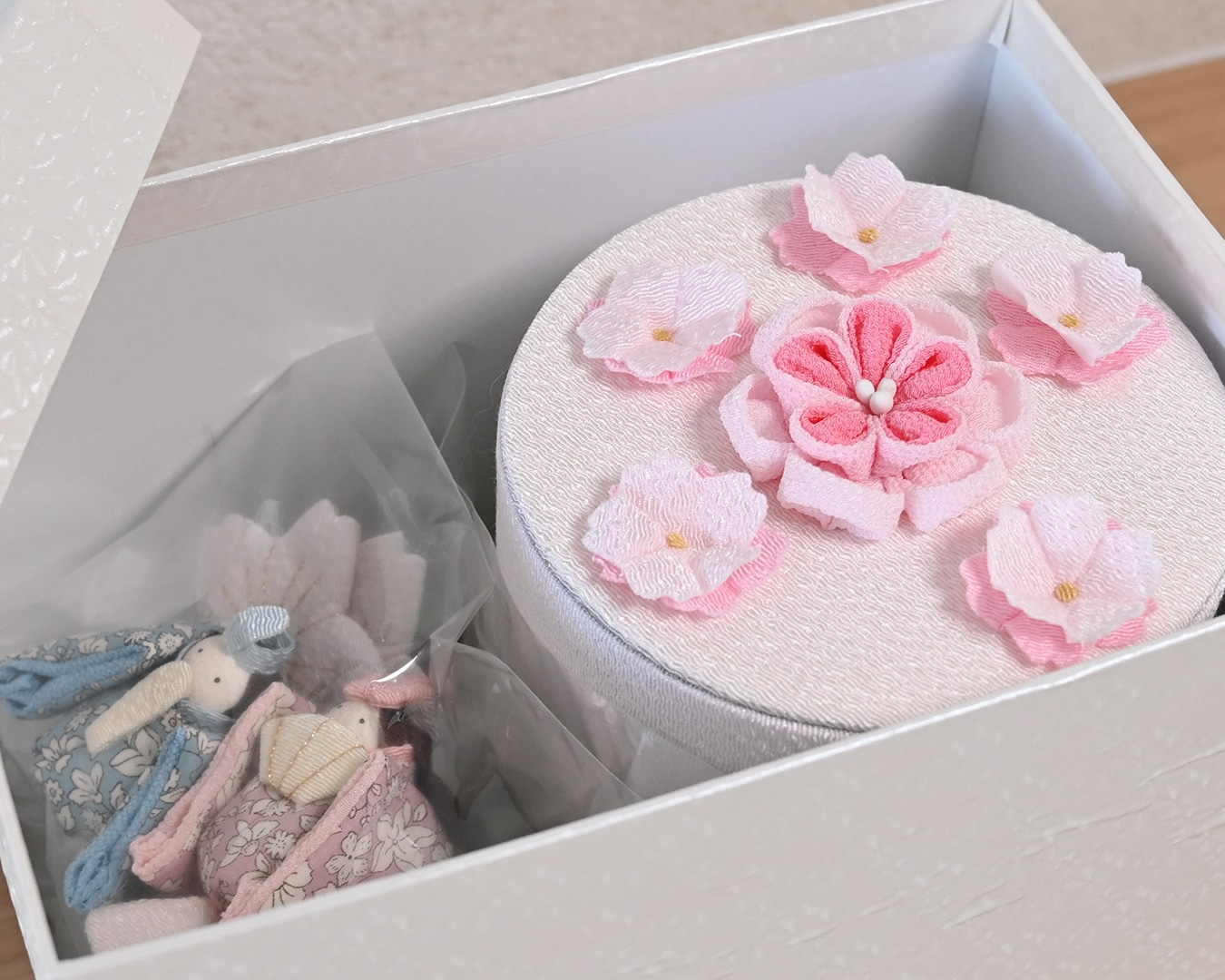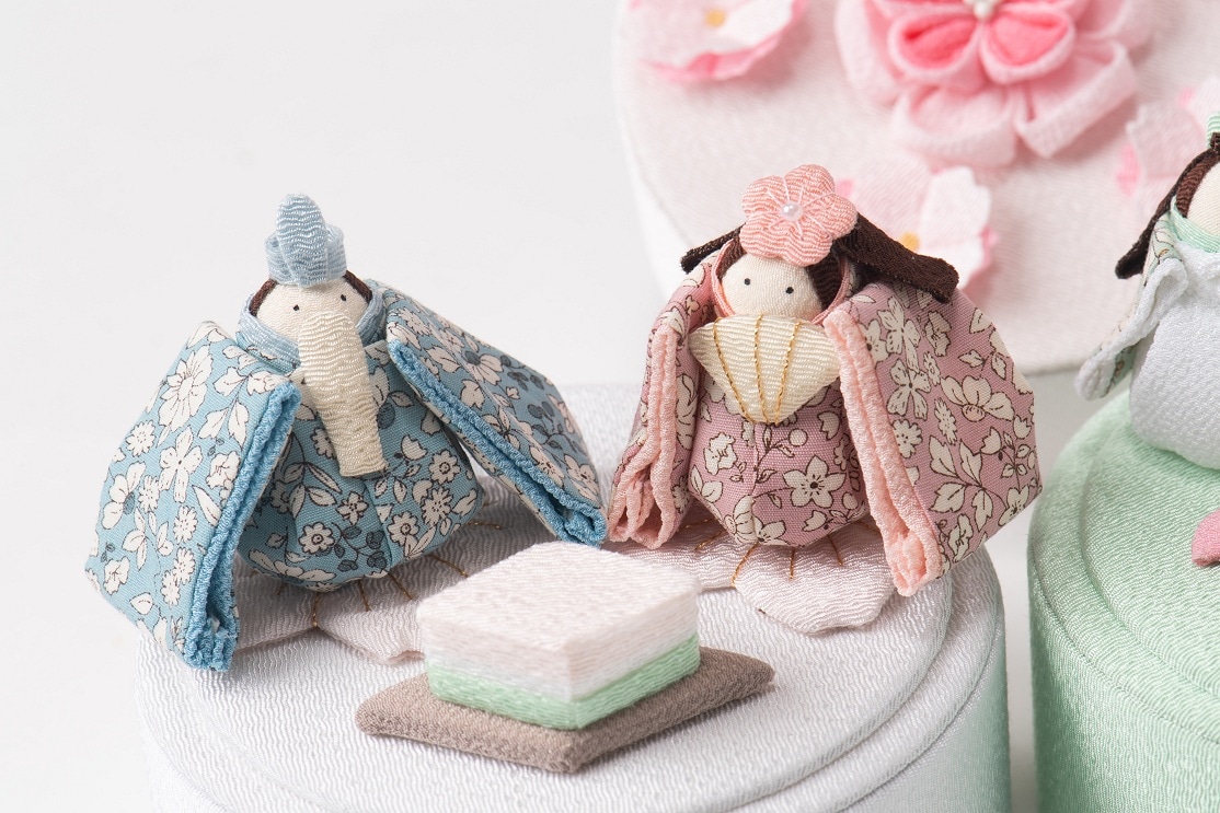 コットンとちりめんを組み合わせた、やさしいくすみカラーの雛人形。淡いピンクやベージュの色合いが、空間に自然と馴染みながらも、お子様の初節句をやさしく彩ります。見た目にも柔らかく、上品な印象です。