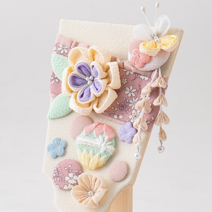 羽子板の右上に飾られた髪飾りは、取り外してヘアピンとしても使用可能。お正月や七五三などの屋外イベントでも、お子さまの晴れの日を華やかに彩ります。